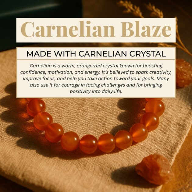 Step into your power with our radiant Carnelian Blaze Bracelet. Handcrafted with real carnelian stones, this vibrant piece glows with warm shades of orange and red, like a spark of fire for your soul. Carnelian is known as the “Stone of Courage” It inspires confidence, boosts creativity, and fills your day with energy.