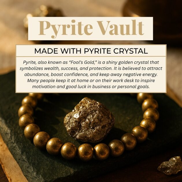 Handcrafted with genuine pyrite stones, this golden beauty is more than just a piece of jewelry. It’s your pocket-sized vault of good luck and prosperity. Known as “Fool’s Gold,” pyrite has been admired for centuries for its rich glow and powerful energy to attract wealth, boost confidence, and protect your spirit.